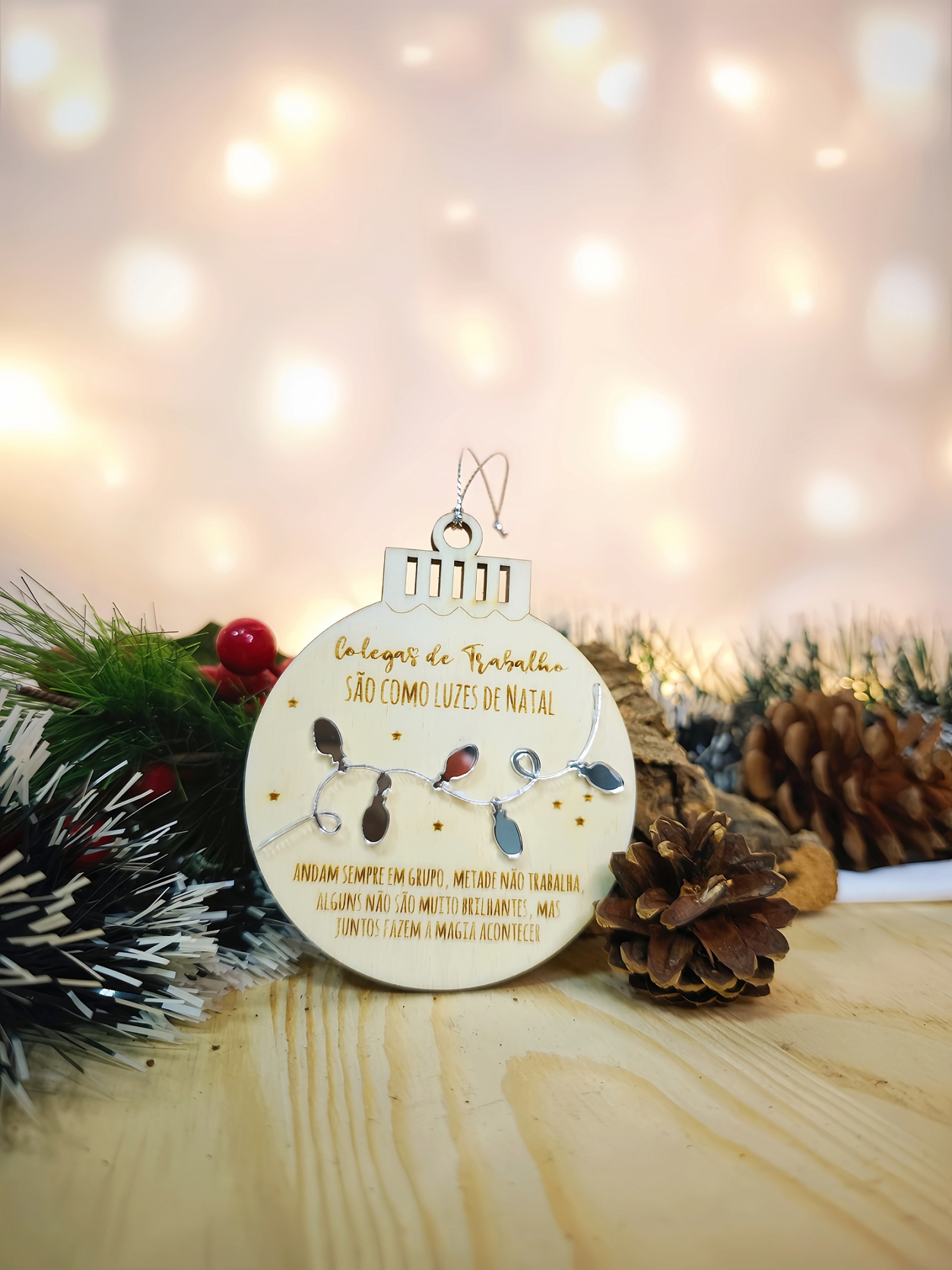 Uma peça divertida, em madeira natural gravada a laser, que vai dar um toque de humor (e ternura!) à árvore de Natal do escritório.