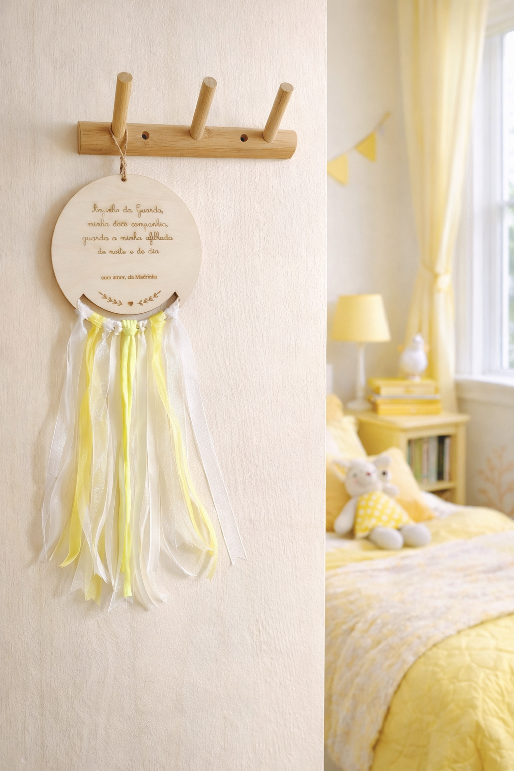 Caça Sonhos em madeira, com oração do anjo da guarda gravado, com fitas em cor à escolha.