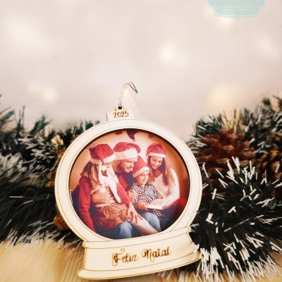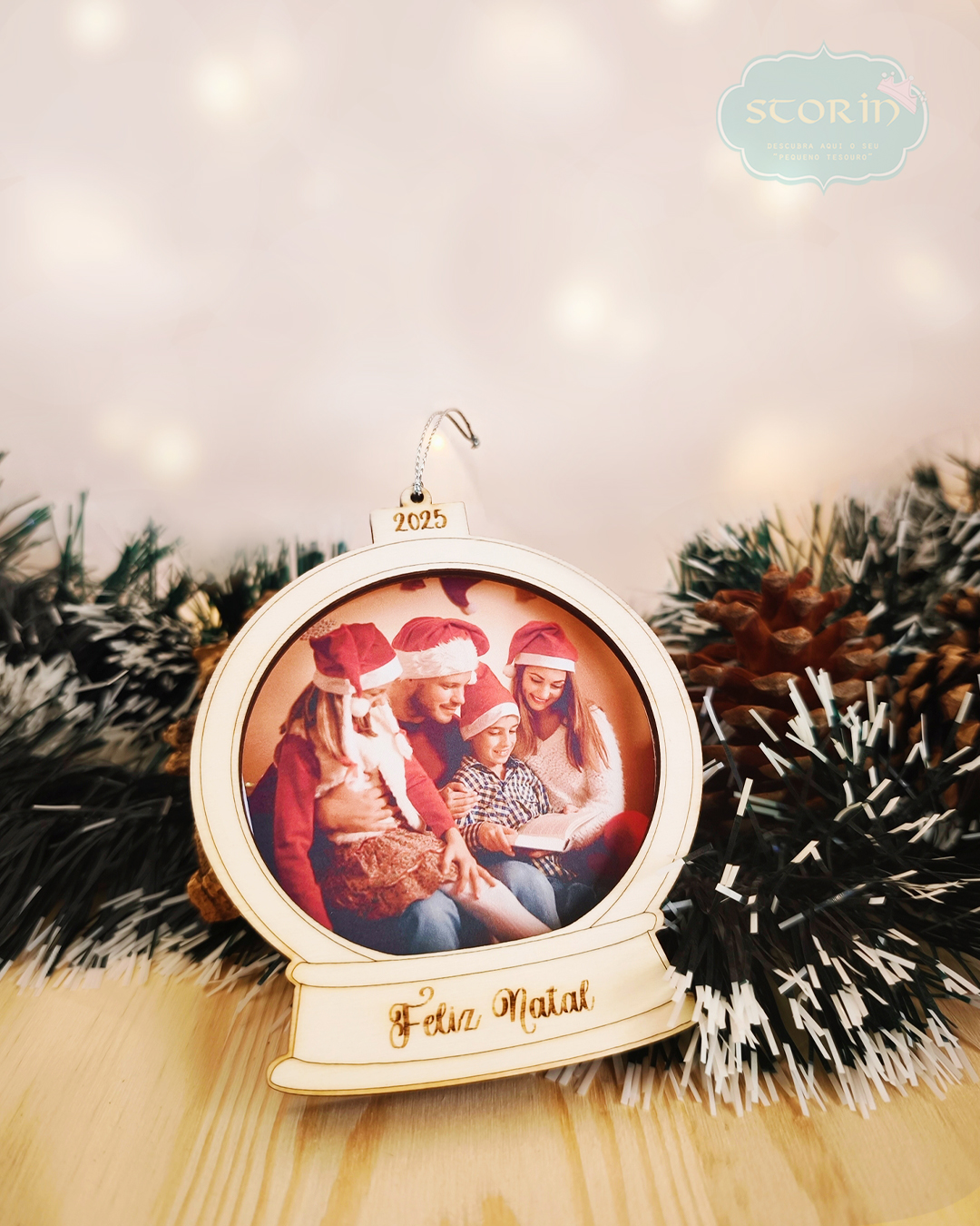 Um pormenor delicioso para as vossas árvores. Uma bola de Natal em madeira, para colocar a foto lá dentro.