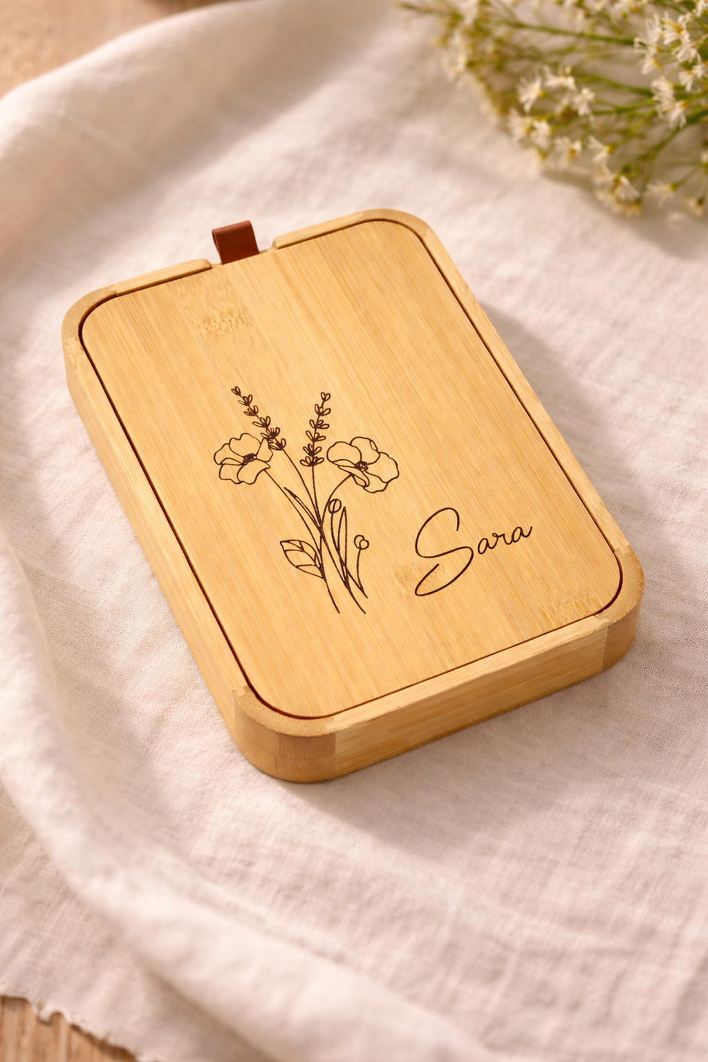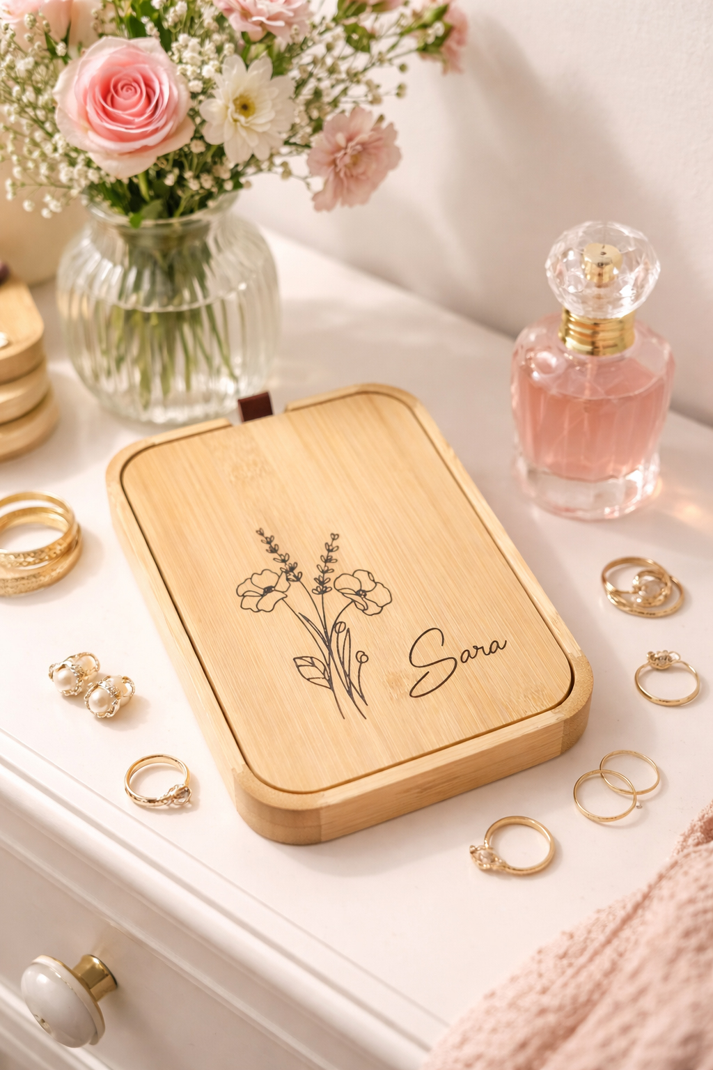 Com um design minimalista e delicado, inclui um espelho no interior e compartimentos organizados para manter anéis, brincos e pulseiras sempre à mão. A tampa pode ser personalizada com o nome ou palavra que quiseres, tornando-o numa peça verdadeiramente única.