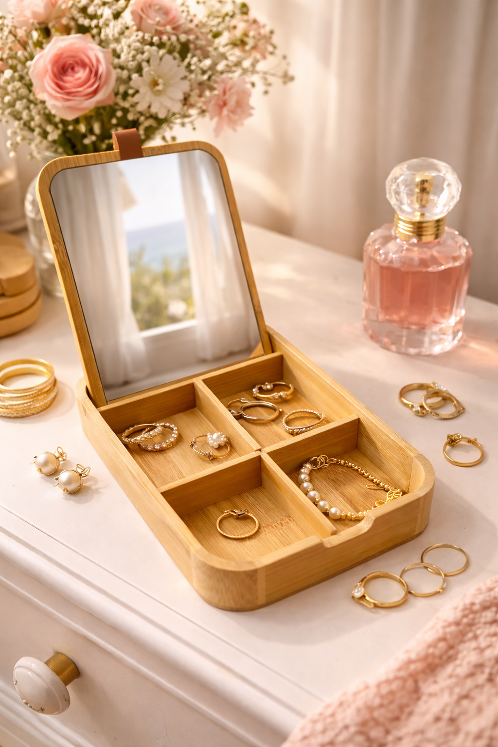 Este porta-jóias em bambu natural combina elegância, leveza e um toque pessoal único 💛